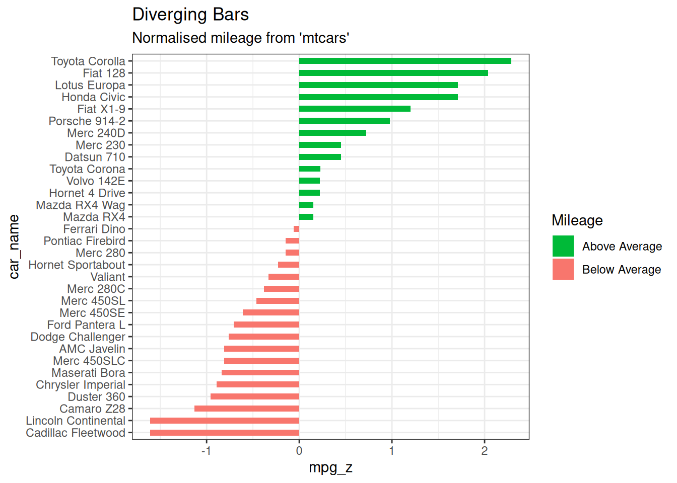 Set stat=identity provide both x and y inside aes() where, x is either character or factor and y is numeric. In order to make sure you get diverging bars instead of just bars, make sure, your categorical variable has 2 categories that changes values at a certain threshold of the continuous variable. In below example, the mpg from mtcars dataset is normalised by computing the z score. Those vehicles with mpg above zero are marked green and those below are marked red.