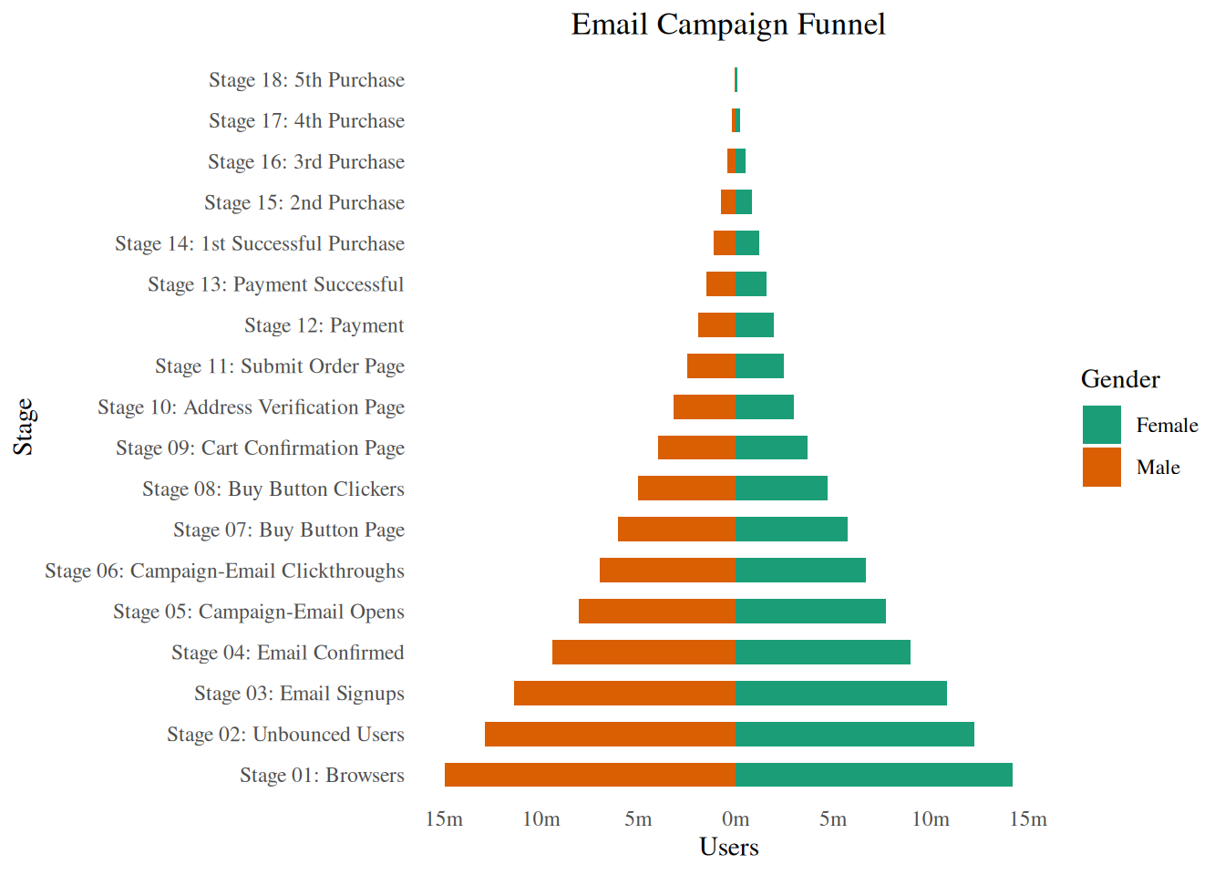 Population pyramids offer a unique way of visualizing how much population or what percentage of population fall under a certain category. The below pyramid is an excellent example of how many users are retained at each stage of a email marketing campaign funnel.