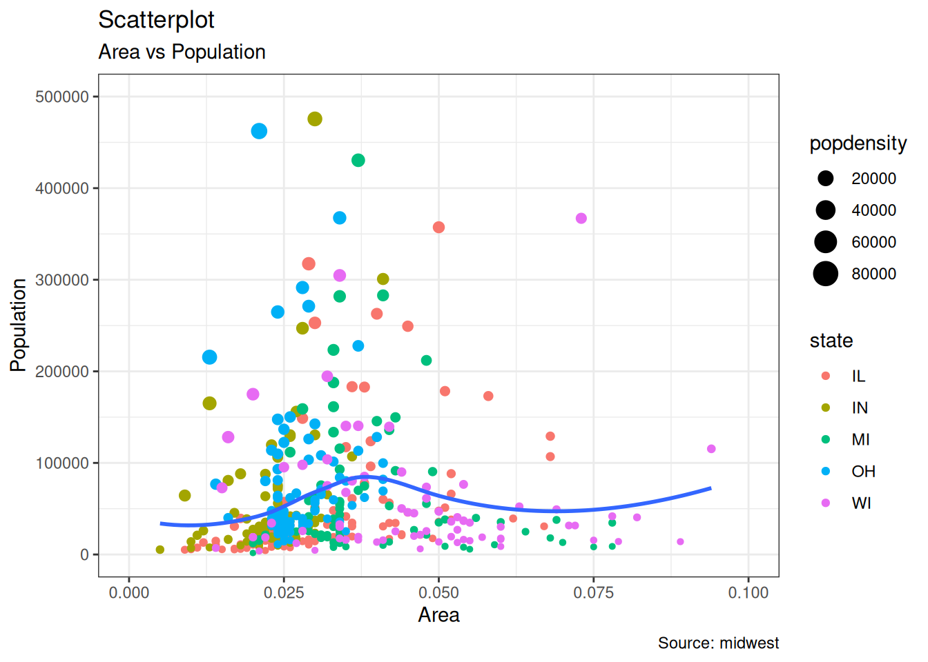 geom_point(aes(col = state, size = popdensity)) + # draw points
