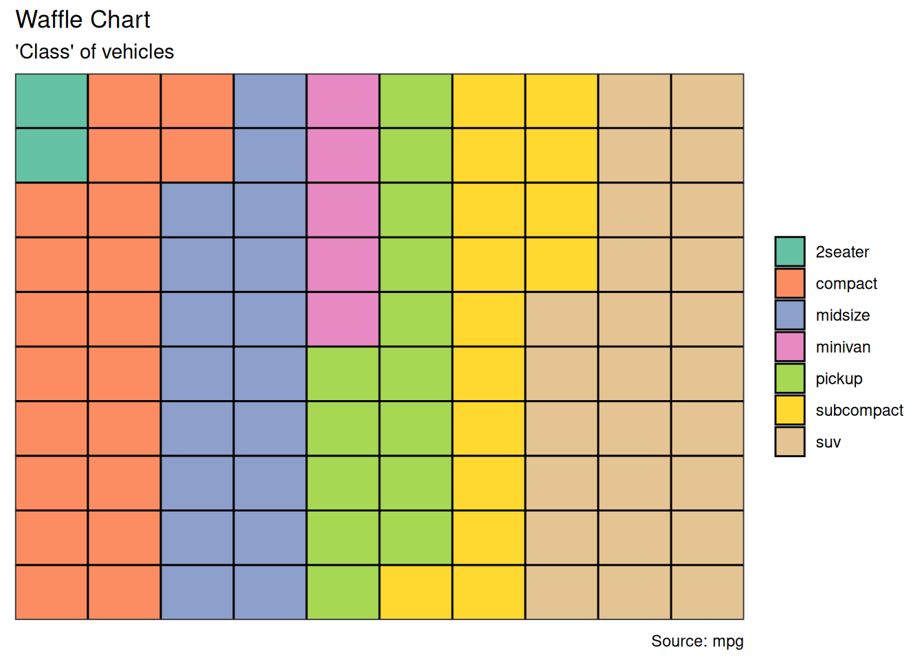 title = "Waffle Chart", subtitle = "'Class' of vehicles",